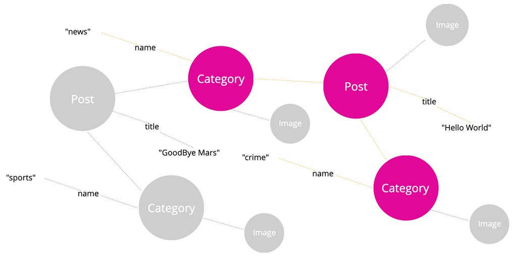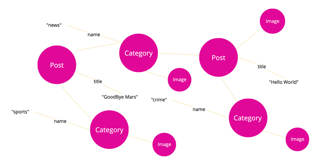 Which, visually represented would look like the following, where the Post is returned, the 2 connected categories, and their names, but the request stops there, as it did not ask to traverse any deeper connections to the categories, or other connections of the Post, such as the connected Image.